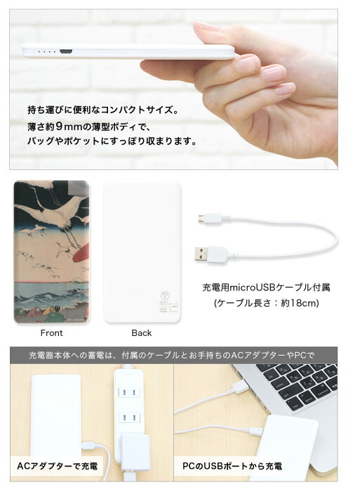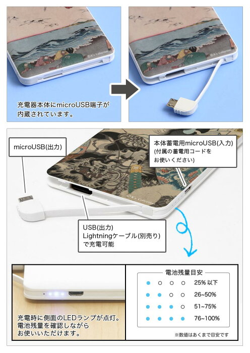 【PSE適合品】全8種 浮世絵 急速充電 USB出力 リチウムイオンポリマー充電器 2.1A 4000mAh 歌川豊国 歌舞伎 歌川広景 歌川芳虎 オシャレ モバイルバッテリー microUSBケーブル付属 iPhone Android LEDランプ